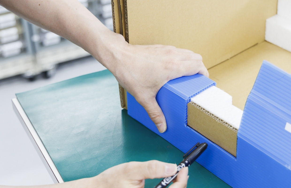 一部の製品では、梱包材の貼付部を特殊な形状に加工するための「ケガキ作業」が発生します。従来は、図面を見ながら都度スケールで測って作業を行っていましたが、現場の発案で専用のケガキ用治具を製作。これにより、従来は20分ほどかかっていた工程が1分に短縮され、大幅な生産改善につながりました。