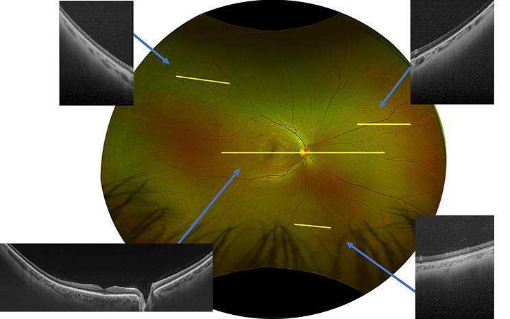 眼底の約80%の領域をカバーする眼底画像と、その領域における任意の位置の断層画像を1台でとらえます。網膜中心部に多く発生する緑内障や加齢黄斑変性症にくわえ、眼底周辺部に多く発生する網膜剥離や網膜裂孔、眼腫瘍などの異変をとらえます。これにより、網膜中心部から周辺部における、眼疾患の有無や重症度の確認が可能となり、病気の早期発見に貢献します。