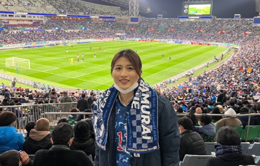 幼少期から高校時代まで水泳に打ち込んでいたこともあり、スポーツが好きです。特にサッカー観戦は楽しみの一つ。写真は、埼玉スタジアムで行われた日本対ベトナムの試合を観戦したときの一枚です。観るだけでなく、ジョギングや水泳など、時間をみて体を動かしています。