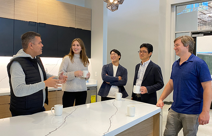 新製造拠点の前で、同僚と共に。新製造拠点はビジネスオペレーション機能と先進的な製造施設の両方が入居する。