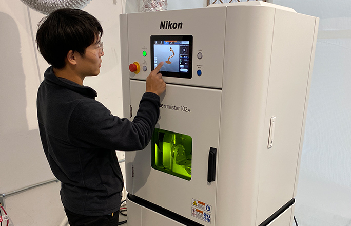 ニコンの「金属 3D プリンター」を前に。ニコンは2019年に「金属プリンター」を日本市場に導入、その後新機能追加等で進化を加速させている。
