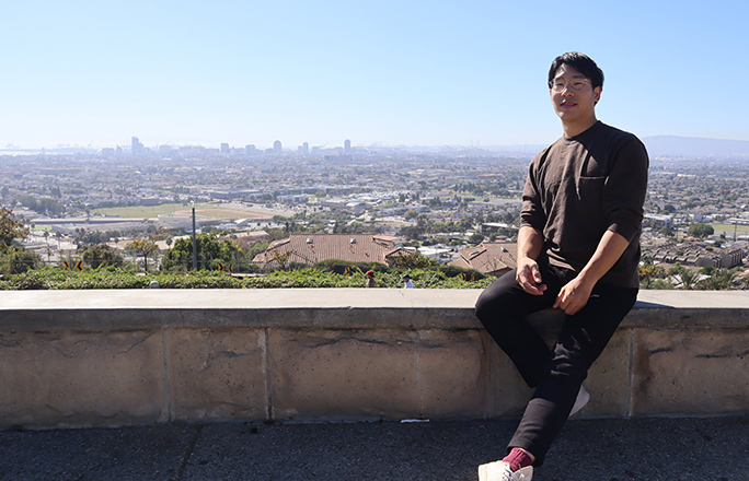 オフの日は、近所の見晴らしの良い公園でくつろぐことが多い。遠くに見える街はカリフォルニア州ロングビーチのダウンタウン。