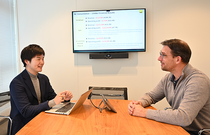 所属部署のオランダ人上司と1on1の会議。普段から密なコミュニケーションを心掛ける。