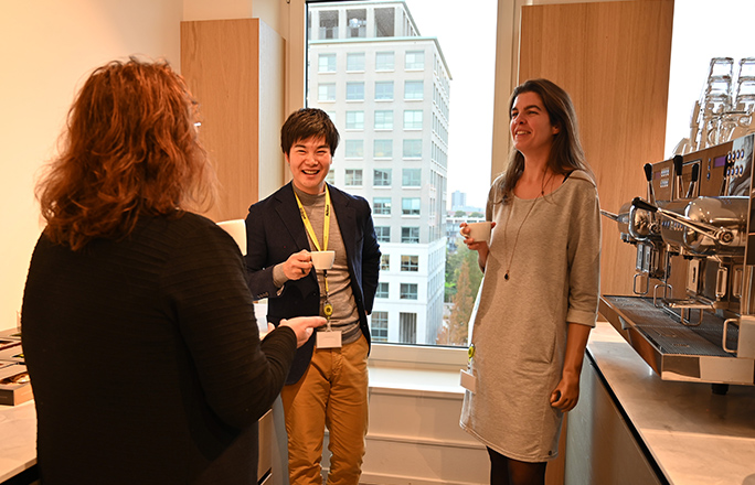 同僚とカフェスペースで雑談。週末の予定などについて話す。Nikon Europe B.V.オランダ本店は総勢約120人。内、日本人駐在員は計12名。
