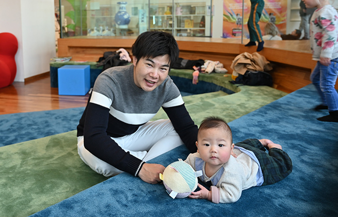 自宅近くの図書館にあるキッズスペースで子どもと遊ぶ。家族と過ごす時間を大切にしながら、ヨーロッパでの生活を満喫。