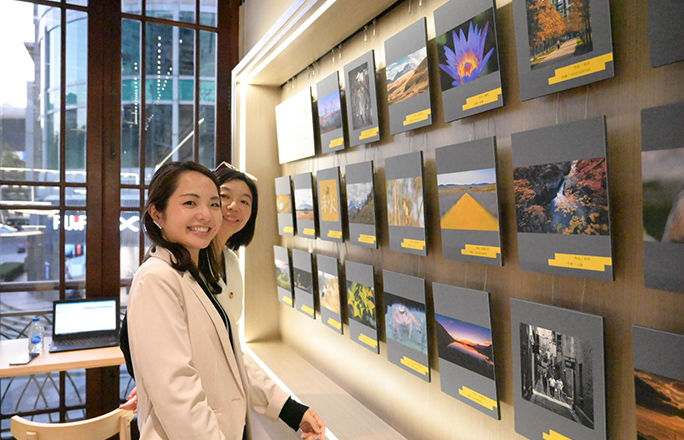 上海直営店で、お客様の写真を展示しているギャラリーの前で。アプリ上でフォトコンテストを実施しオフラインで展示。インタラクティブな店舗運営に取り組んでいる。