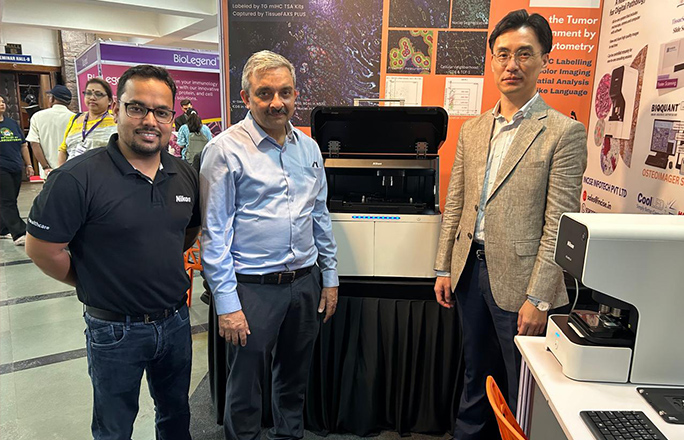 バンガロールで開催された免疫学会での風景。ブース出展を実施し、学会に来場された研究者の皆様に新発売のデジタル顕微鏡をPR。