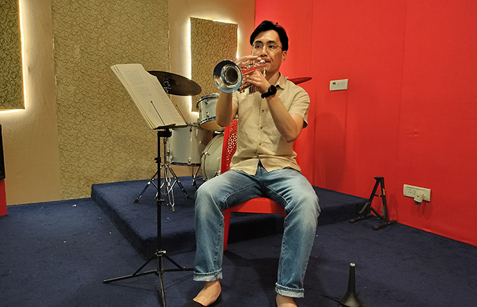 グルガオン市内の音楽スタジオでのトランペットを練習。中学・高校と吹奏楽部に所属していた。週末は教則本を片手に練習に徹している。
