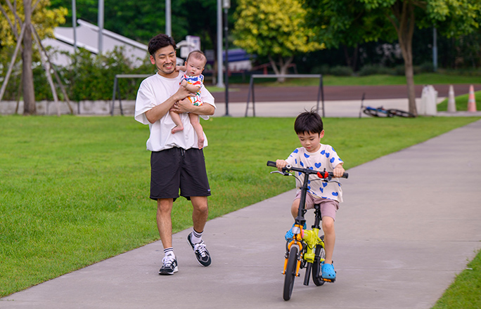 近所の公園にでかけ、子どもたちと自転車レーンで遊ぶ。子育てにも恵まれた環境で、週末は街中や観光地で過ごしたり、泊まりがけで小旅行に行くことも。