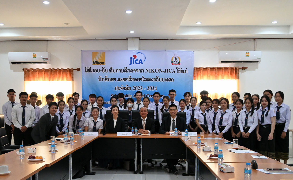 ニコンと独立行政法人国際協力機構(JICA)は、2014年から国立サバナケット大学でニコン・JICA奨学金の運営を協働しています。ニコンは毎年40名の学生に奨学金を支給しており、これまでのべ400名を支援してきました。2018年からは、ラオスと日本をつなぐ産業人材の育成をめざし、奨学金での日本語学科生の優遇や、日本語学科の教育人材不足に対する指導助手などの雇用支援を行っています。