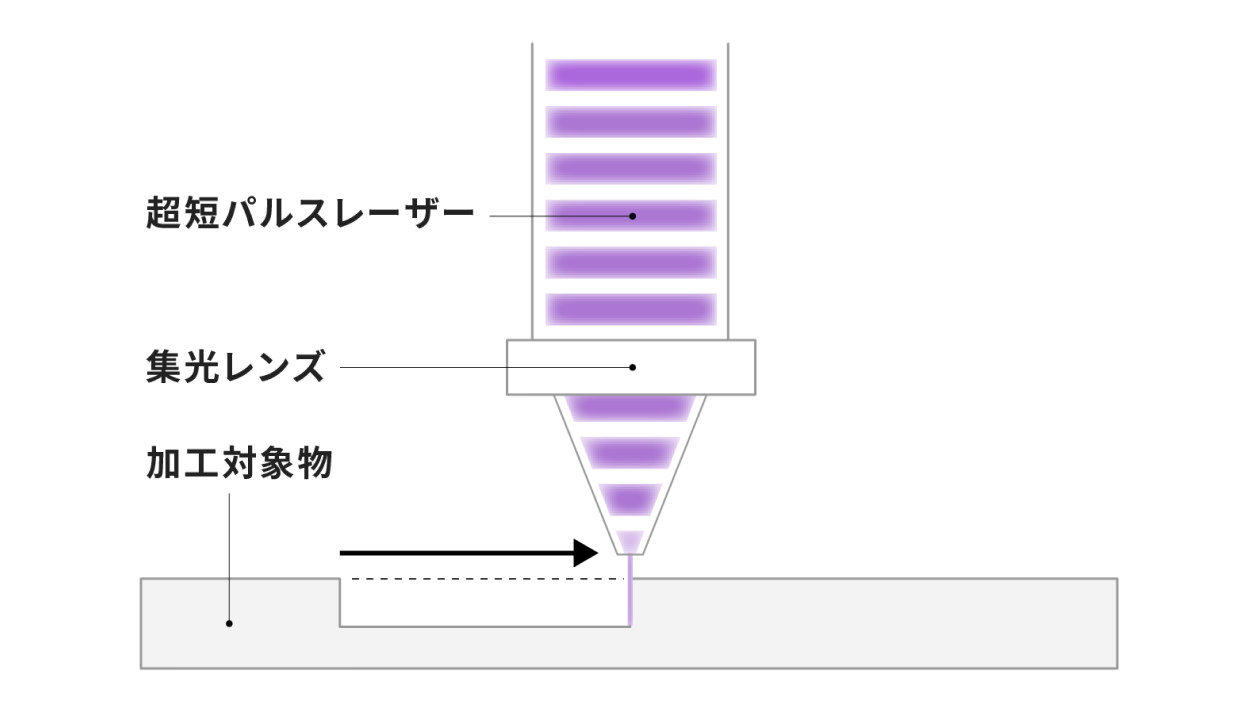 レーザーを用いて物質を除去する加工方法であり、金属、ガラス、セラミックスなどのほぼすべての固体材料に対して適用できます。非接触で加工できるため複雑な形状に対応しやすく、特に超短パルスレーザーを用いれば熱の影響がほかの加工方法と比べ小さく所望の形状に加工しやすくなります。高精度な計測と組み合わせることで加工のための治具が不要な点も利点です。